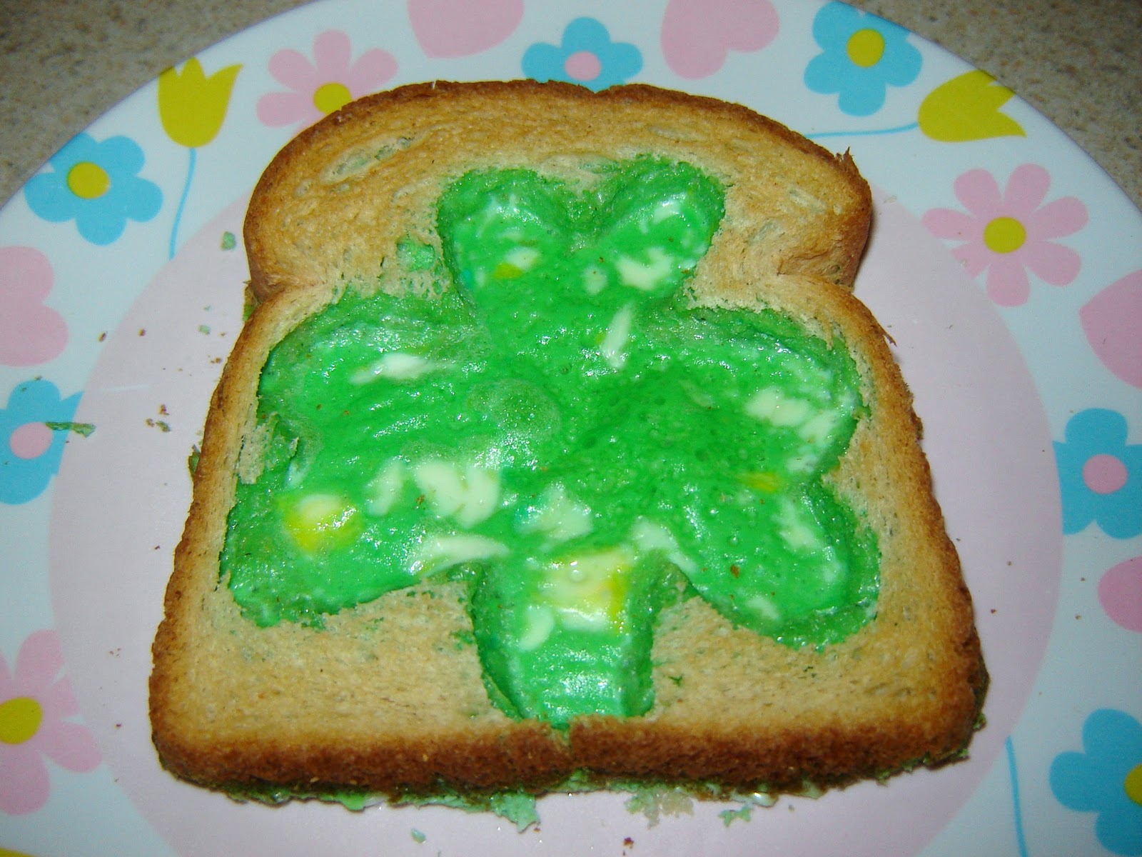 Using a shamrock shaped cookie cutter cut the middle out of a slice of bread.
